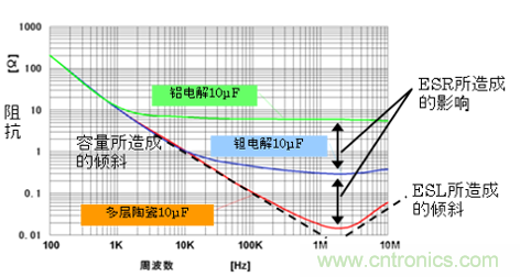 多層陶瓷電容器具有良好的高頻特性。與其他電容器相比,由於其具備能夠減小電阻及殘餘電感的構造,因此在高頻條件下也能保證 電容器的工作。圖3、圖4所示為等效電路與電感的特性。由於鋁電解電容器及鉭電解電容器的ESR較高,因此阻抗也就較高。但陶瓷電容器卻是頻率越高則阻抗 越低,這對於去藕來說非常有效,並能夠發揮高性能的濾波能力。