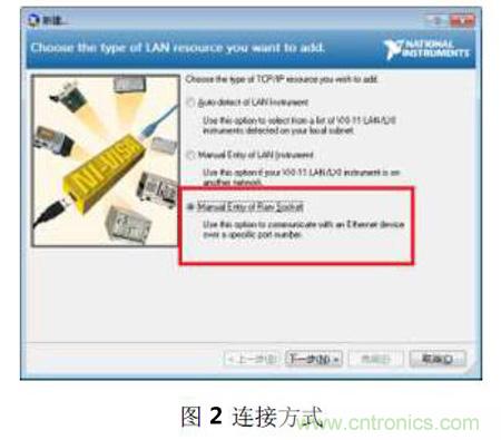 啟動Masurement & Automation Explorer 軟件,選擇設備和接口,在添加網絡設備中,使用Manual Entry of Raw Scoket(手動輸入原始SOCKET)方式連接,ZDS2024 示波器采用端口號5025 來接收SCPI 命令。如圖2和圖3所示。設置好後,可進行測試,確保連接成功。