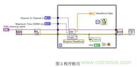 左邊的三個控製用於輸入設置,包括連接的VISA 資(zi)源(yuan)名(ming)稱(cheng),獲(huo)取(qu)數(shu)據(ju)的(de)通(tong)道(dao),最(zui)大(da)延(yan)遲(chi)時(shi)如(ru)何(he)實(shi)現(xian)對(dui)示(shi)波(bo)器(qi)的(de)遠(yuan)程(cheng)控(kong)製(zhi)間(jian)。右(you)邊(bian)為(wei)結(jie)果(guo)波(bo)形(xing)顯(xian)示(shi)控(kong)件(jian)。設(she)計(ji)好(hao)前(qian)麵(mian)板(ban)以(yi)後(hou),就(jiu)可(ke)以(yi)進(jin)入(ru)程(cheng)序(xu)框(kuang)圖(tu)設(she)計(ji)了(le)。在(zai)VI 的程序框圖中的Function 麵板中,選擇“儀器I/O”可以找到有關ZDS2024 的驅動庫的模塊,可以在程序框圖中直接使用,設計結果如圖5所示。