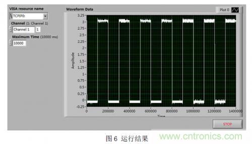 在程序框圖中,先初始化示波器,並啟動示波器的AutoSetup 功能,然後循環獲取示波器的數據,並送顯示,直到用戶中止或者獲取數據過程中出現錯誤。最後可以在前麵板啟動運行,結果如圖6所示。