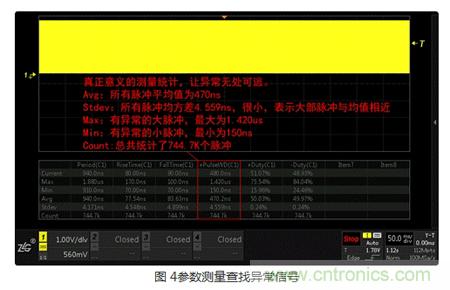 僅僅通過波形的直觀表現來分析異常信號遠遠不夠,隻有將波形各項指標精確量化,才能看透波形異常的本質。ZDS2000係列示波器標配的51種“真正意義”的參數測量,會把屏幕上捕獲的所有波形進行統計分析,得出每一項的當前值、最大值、最小值、平均值、標準差、統計次數,用戶通過觀察最大值和最小值可快速了解波形中可能存在的異常,通過觀察平均值、標準差可快速評估信號特性。