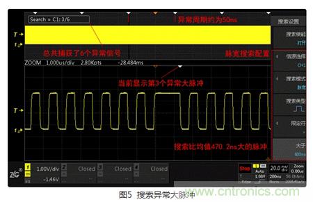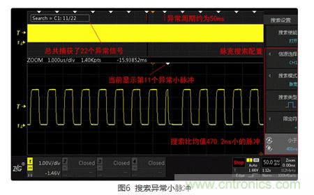 在(zai)調(tiao)試(shi)異(yi)常(chang)信(xin)號(hao)時(shi),我(wo)們(men)通(tong)常(chang)需(xu)要(yao)明(ming)確(que),異(yi)常(chang)出(chu)現(xian)的(de)頻(pin)率(lv)是(shi)多(duo)少(shao),是(shi)不(bu)是(shi)周(zhou)期(qi)性(xing)出(chu)現(xian)的(de)呢(ne)?為(wei)了(le)弄(nong)清(qing)楚(chu)這(zhe)些(xie)問(wen)題(ti),一(yi)般(ban)需(xu)要(yao)長(chang)時(shi)間(jian)記(ji)錄(lu)波(bo)形(xing),然(ran)後(hou)基(ji)於(yu)這(zhe)樣(yang)一(yi)個(ge)龐(pang)大(da)的(de)數(shu)據(ju)庫(ku)去(qu)定(ding)位(wei)和(he)分(fen)析(xi)異(yi)常(chang)。ZDS2000係列示波器標配的“搜索功能”,可以在海量的數據中快速定位出感興趣的信號,並自動做出標記,用戶通過觀察標記可快速了解異常的位置、頻率、周期等特性。