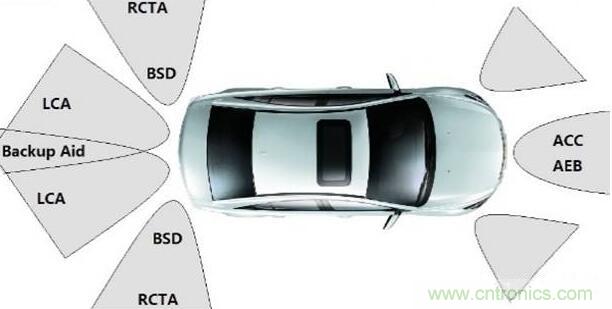 應用於汽車的防撞雷達一般工作在兩個頻段:24GHz-24.25GHz和76GHz-81GHz;工作在24GHz頻段的防撞雷達一般安裝在汽車後向,實現盲區監測(BSD),變道輔助(LCA)以及倒車側向警告(RCTA)等功能;工作在76GHz-81GHz頻段的毫米波防撞雷達一般安裝在汽車前向,用於實現自適應巡航(ACC),緊急製動(AEB)等功能。汽車防撞雷達不同功能覆蓋區域如圖1所示: