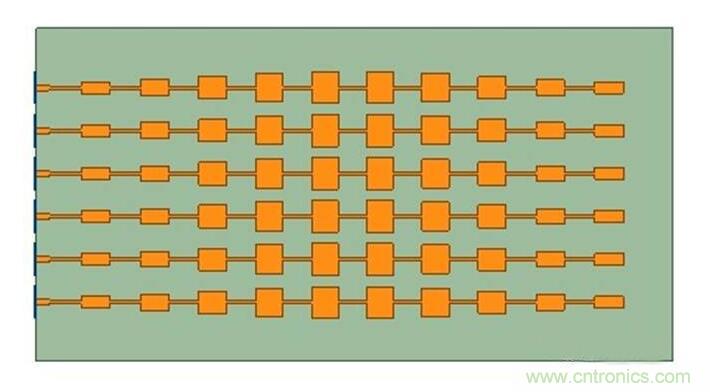 根據增益與波束寬度的要求確定該串饋微帶貼片線陣單元數為10,副瓣電平小於-20dB;采用厚度為5mil的RO3003介質基板,經理論分析與仿真軟件優化。仿真模型如圖4所示