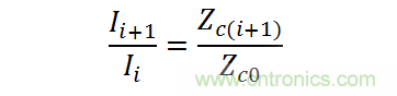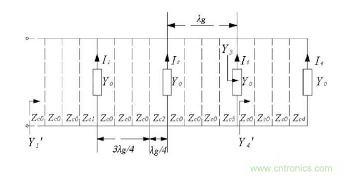 圖中Yo為連接功分網絡的串饋線陣等效導納,Zci為各阻抗變換段的特性阻抗,Zco為饋線的特性阻抗;串饋網絡輸出端口激勵電流與阻抗有如下的關係[4]