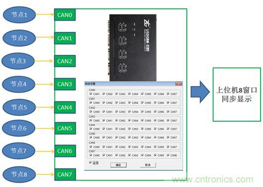 若(ruo)將(jiang)每(mei)個(ge)節(jie)點(dian)單(dan)獨(du)取(qu)出(chu)做(zuo)測(ce)試(shi),則(ze)必(bi)然(ran)破(po)壞(huai)原(yuan)有(you)通(tong)信(xin)規(gui)則(ze)。如(ru)何(he)在(zai)不(bu)破(po)壞(huai)原(yuan)有(you)通(tong)信(xin)的(de)基(ji)礎(chu)上(shang)搞(gao)清(qing)楚(chu)一(yi)個(ge)陌(mo)生(sheng)的(de)收(shou)發(fa)協(xie)議(yi)呢(ne)?所(suo)謂(wei)工(gong)欲(yu)善(shan)其(qi)事(shi),必(bi)先(xian)利(li)其(qi)器(qi)。您(nin)需(xu)要(yao)一(yi)個(ge)能(neng)同(tong)時(shi)收(shou)發(fa)、轉送多路CAN數據的CAN卡,USBCAN-8E-U正是為這種應用而生。