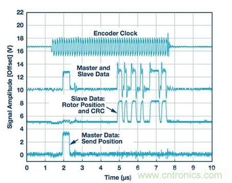 圖6顯示了EnDat係統的測試結果。測試使用的時鍾頻率為8 MHz,延遲補償通過接收時鍾相移實現。底部信號是來自EnDat主機的命令。此處顯示的命令為“發送位置”,其前麵是兩個0,接著是六個1,最後又是兩個0。該命令總共有10位。編碼器的響應是從頂部起的第三個信號。合並數據線是從頂部起的第二個信號。最後,頂部信號是施加於編碼器的時鍾。