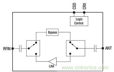 圖 1: Skyworks 的 SKY66113-11 將 LNA 與數字控製集成。該器件還使用了旁路開關,讓係統可以根據需要在無 LNA 的情況下工作。(圖片來源: Skyworks)