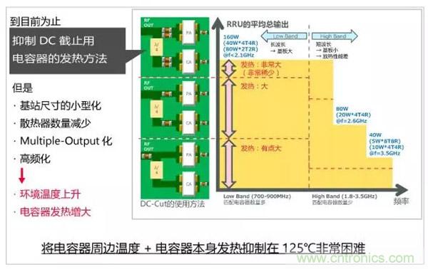 但是,近年來隨著Multiple-Output化(Tx增加)加jia速su,一yi方fang麵mian元yuan件jian數shu量liang增zeng加jia,而er由you於yu基ji站zhan尺chi寸cun小xiao型xing化hua,散san熱re器qi等deng散san熱re對dui策ce可ke用yong的de空kong間jian越yue來lai越yue少shao。使shi用yong頻pin帶dai的de進jin一yi度du高gao頻pin化hua,元yuan件jian發fa熱re進jin一yi步bu增zeng大da,將jiang電dian容rong器qi周zhou邊bian溫wen度du和he自zi身shen發fa熱re抑yi製zhi在zai125℃,在電路設計上的製約案例中變得尤為顯著。