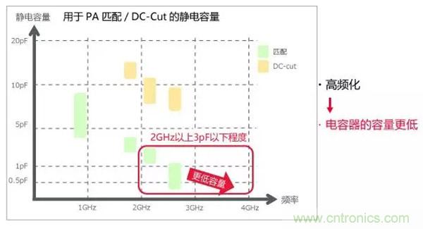 隨著基站用PAMultiple-Output化(Tx的增加),安an裝zhuang元yuan件jian數shu量liang增zeng加jia,另ling一yi方fang麵mian設she備bei尺chi寸cun則ze要yao求qiu和he原yuan先xian一yi樣yang或huo者zhe更geng加jia小xiao型xing化hua,因yin此ci電dian路lu基ji板ban的de高gao密mi度du化hua就jiu變bian得de越yue發fa重zhong要yao。匹pi配pei用yong電dian容rong器qi尺chi寸cun變bian小xiao自zi然ran不bu錯cuo,但dan是shi一yi般ban來lai說shuo,尺chi寸cun小xiao的de電dian容rong器qiQ值變低,額定電壓也變低。此外,因為頻帶越高Q值越低,所以盡可能選擇Q值高的電容器,但以高頻標準選擇的靜電容量小的電容器,在構造上、High-Q規格上與標準規格相比,很難獲得Q值的改善效果。