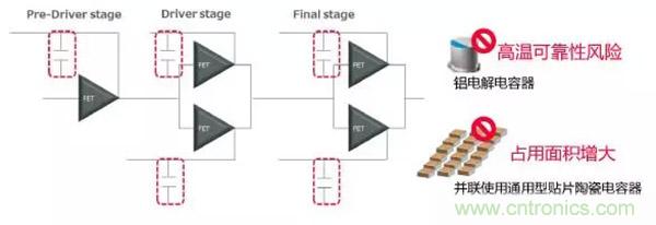 電解電容器具有每個都能獲得大的靜電容量的好處,但因在類似基站PA這樣的高溫、在長時間連續工作的環境下存在可靠性方麵的風險,所以不受歡迎。現在Vdrain的晶體管用電容器多采用通過將10~20個1210尺寸的多層陶瓷電容器(125℃保證、50Vdc~100Vdc、4.7uF~10uF)並列連接,保證靜電容量的設計。