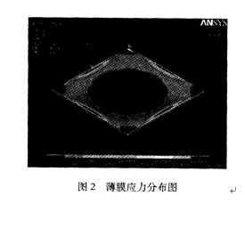 利用有限元分析軟件ANSYS對接觸式結構的薄膜工作狀態進行了模擬。材料為Si,膜的形狀為正方形,邊長1000 μm,膜厚5 μm,極板間距10 μm。在1.01×105Pa的大氣壓力下,薄膜中央接觸部分及四個邊角基本不受應力,四邊中央應力最大為1.07 MPa,小於矽的屈服應力7 MPa,其應力分布如圖2所示。