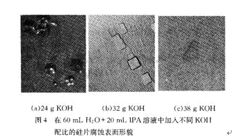 四棱錐和四棱台的四個斜麵對應於腐蝕速率最低的(111)係列晶麵。當濃度較低時,(100)和(111)晶麵的腐蝕速率比小,所以出現小丘;當濃度增大時,(100)和(111)晶麵的腐蝕速率比增大,所以出現小坑;濃度達到一定程度後,(100)和(111)晶麵的腐蝕速率比趨於穩定,依然出坑,而(110)和(111)晶麵的腐蝕速率比增大,從而產生斜坡。隻有調整KOH的濃度,得到匹配的(100)、(110)、(111)晶麵的腐蝕速率,才能獲得較好的腐蝕表麵。試驗還表明,溫度主要影響腐蝕速率,對矽片腐蝕形貌影響不大。