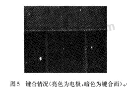 目前真空腔的形成多采用Si—Si鍵合或者陽極鍵合。本方案采用陽極鍵合,是因為陽極鍵合比Si—Si鍵合的要求低。首先溫度隻需要400~500℃,其次表麵光潔度要求也相對較低。本工藝過程中存在金屬電極,不適於用高溫;鍵合麵存在高約1400 nm,寬為20μm的電極引線,鍵合麵的SiO2經過一定程度的KOH各向異性腐蝕後粗糙度為100nm左右,經過試驗證明,鍵合情況良好(圖5),並具有良好的密封效果。