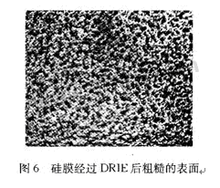 反應離子深刻蝕(DRIE)能刻出非常深的垂直結構,本試驗用於最後矽薄膜的形成。DRIE的刻蝕效果(刻深為250 μm)沒有KOH腐蝕的平坦,刻蝕表麵比較粗糙,表麵顆粒起伏為幾個微米,如圖6。此外刻蝕存在不均勻性,75 mmguipiansizhouyijingkedaodianjiluchu,erguipianzhongyangdedianjihaimeiyouluchu。shenkeshidebujunyunxingyukeshibiaomiandetuxingyouzhemiqiedelianxi,danqizhongdechengyinhejilimuqianhaimeiyoujutihelidelilunhejieshishuoming。yinerwufaconglilunshangzhidaoguihuakeshibiaomiandexingzhuangsheji,gengduodeshiyikaojingyanshoudongdiaozheng。