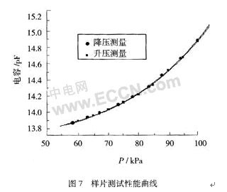 在室溫19.34℃的條件下,對壓力傳感器進行測量。測量設備為Druck的DPI610IS,測量電路采用了AD公司的AD7745電容測量芯片,精度能達到4 fF。測量曲線如圖7所示,測試精度為8.1‰。由you於yu矽gui薄bo膜mo較jiao厚hou,測ce量liang範fan圍wei內nei的de線xian性xing部bu分fen不bu多duo,此ci外wai電dian容rong電dian極ji的de麵mian積ji利li用yong率lv不bu高gao使shi得de電dian容rong的de變bian化hua量liang也ye小xiao,這zhe些xie都dou是shi造zao成cheng性xing能neng不bu高gao的de主zhu要yao原yuan因yin,但dan由you圖tu可ke以yi看kan出chu測ce量liang曲qu線xian存cun在zai很hen好hao的de一yi致zhi性xing和he重zhong複fu性xing。