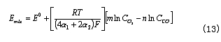 在COCO濃度對數呈線性關係。2一定的條件下,Emix也與如果在氧氣的電化學反應為電荷傳輸過程控製,且過電位較大,而CO的氧化反應由擴散極限控製,那麼聯立等式(4)、(6)、(9)和(11),得到平衡混合電勢為: