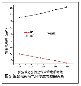 在常氧濃度條件下仍然得到了EmixCO的濃度的對數呈線性關係。與 Elisabetta Di Bartolomeo 等人製備了PtYSZPtWO3電池,並且觀察到其混合電勢與NO2,CO氣體濃度的對數呈線性曲線的響應行為,如圖2所示。如果EmixCO的氧化反應由擴散極限控製,那麼聯立擴散質量傳輸限製方程(4)、線性氧還原等式(15)、(6)和(9)得到平衡混合電勢為:接近平衡氧電勢,同時氧氣的還原反應在低過電位下發生,而