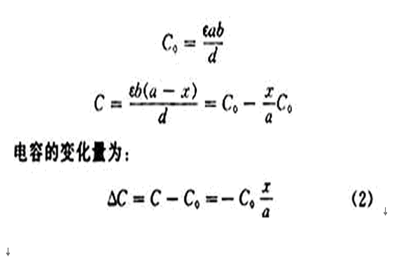 圖1(b)中是利用線位移來改變電容器極板的遮蓋麵積的。如果初始狀態極板全部遮蓋,則遮蓋麵積S0=ab,當2塊極板相對位移x時,則極板的遮蓋麵積變為S1=b(a-x)。在介電常數和極板距離不變時,電容量分別為: