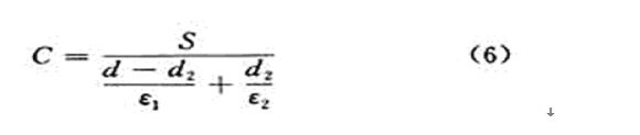 顯然,在電容器極板的遮蓋麵積S,兩極板之間的距離d,被測物體上下側至電極之間介質的介電常數ε1和ε3確定時,電容量的大小就和被測材料的厚度d2及介電常數ε2有關。如被測材料介電常數ε2已知,就可以測量等厚教材料的厚度d2;或者被測材料的厚度d2已知,就可測量其介電常數ε2。這就是電容式測厚儀和電容式介電常數測量儀的工作原理。