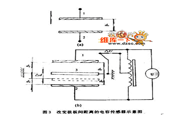 圖3是這類傳感器的原理圖,圖3(a)由2塊極板構成,其中極板2為固定極板,極板1為與被測物體相連的活動極板,可上下移動。當極板間的遮蓋麵積為S,極板間介質的介電常數為ε,初始極板間距為d0時,則初始電容C0為: