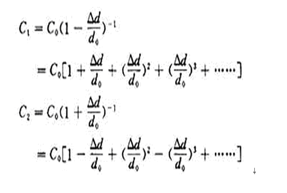 雖然電容的變化量仍舊和位移Δd成非線性關係,但是消除了級數中的偶次項,使線性得到改善。當