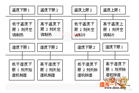 上電初始化,根據板子的撥碼開關的狀態讀取並保存溫濕度儀地址;讀取存在外存中的上次已設置好的溫濕度上下限的曆史值和保存的采樣間隔曆史值。然後,進入主循環中,根據采樣間隔時間,將溫度、濕度、等數據存入外存,點亮LED數碼管顯示當前時間、溫度、濕度,並根據已設置好的溫濕度上下限值來確定是否驅動蜂鳴器報警且控製空調機、加濕機、除濕機工作進行溫濕度控製調節[7](溫濕度上下限控製示意圖見圖3)。係統有良好的交互性能,利用中斷可在線隨時設置時間校正值、溫濕度上下限值、采樣間隔時間值、溫濕度校正值並將這些數據存到外存中;可在線提取當前溫濕度數據和溫濕度儀狀態等數據;可由相應指令提取根據采樣間隔已存在外存中的曆史溫濕度數據。