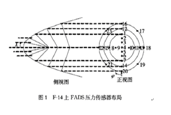 FADS一般安裝在飛行器前端,為了不影響雷達和火控裝置的安裝,也有將FADS安裝在機翼前端。F-14的FADS由23個壓力傳感器組成,安裝在機身前端。X-33的FADS係統則由6個壓力傳感器組成,安裝在機身前端。壓力傳感器的數目並沒有固定的規定。在F-14飛機上,其FADS的壓力傳感器布局如圖1所示。