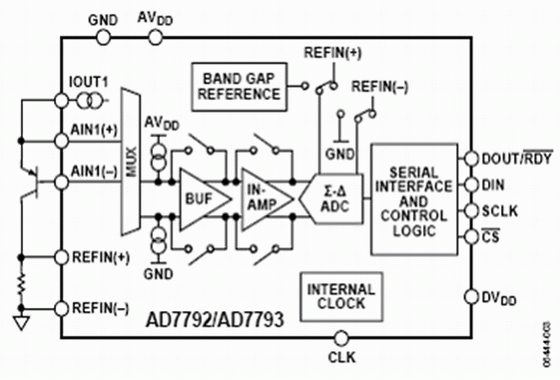 儀表放大器允許開發低噪聲、低溫漂的增益級電路。低噪聲與低溫漂非常關鍵,可以保證因溫度變化引起的電壓變化大於儀表放大器的噪聲電壓。AD7793的增益可以設置為1, 2, 4, 8, 16, 32, 64,或128。利用128倍的最大增益設置以及產生的基準電壓源,AD7793的滿度範圍是±1.17 mV/128 mV或者大約±10 mV。這樣,ADC的高分辨率特點保證無需任何外部放大器元件就可以達到最佳效果。