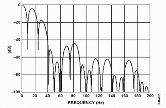 Σ-Δmoshuzhuanhuanqideneizhishuzilvboqiduiyuyizhidaiwailianghuazaoshengyijiqitazaoshengyuanfeichangyouxiao。zaoshengyuanzhiyishidianliwanggongdianxitongchanshengdepinlv。dangdianliwangweiqijiangongdianshi,jiangchansheng50 Hz及其倍頻的供電係統頻率(在歐洲),或產生60 Hz及其倍頻的供電係統頻率(在美國)。窄帶模數轉換器主要采用sinc濾波器。AD7793有4個濾波器選項,模數轉換器可以根據更新速率自動選擇需要使用的濾波器種類。在16.6 Hz的更新速率使用sinc3濾波器。如圖5所示,sinc3濾波器在頻譜內存在凹槽。當輸出字速率為16.6 Hz時,可以利用這些凹槽同時抑製50 Hz或60 Hz的頻率。