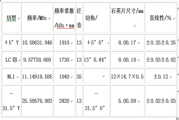 石英晶體的頻率溫度特性方程為:f=fO(1+aΔT+bΔT2+cΔT3),由此可見,通過切角的選擇,使係數b和c接近於零,可提高頻率溫度的線性度。石英晶體溫度計就是利用石英晶體的頻率溫度特性原理製成的。最先采用的為+5°Y切型,後來美國發明了溫度特性極好的LC切型,日本發明了NL切型,東洋通信研製的-31.5°Y切型的詳情見表1。
