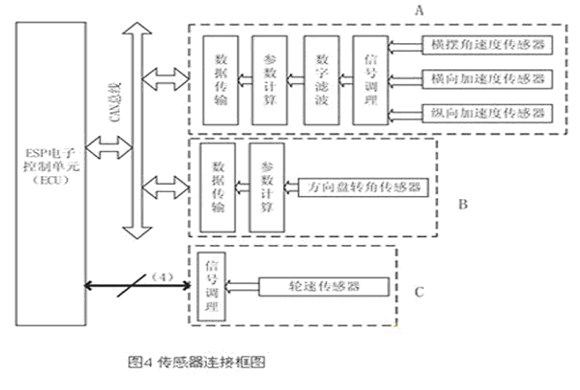 本文所作設計的框圖如圖4所示。在圖中,方向盤轉角傳感器信號經微控製器處理後,通過CAN總線發送給ECU(圖4中B);橫擺角速度傳感器、縱向/橫向傳感器由於信號特點和安裝位置類似,故設計在同一個模塊內(圖4中A);由於ESP對輪速傳感器信號的實時性要求較高,故經過信號調理後,直接送入ECU(圖4中C)。在圖4的A和B中,需要微處理器對信