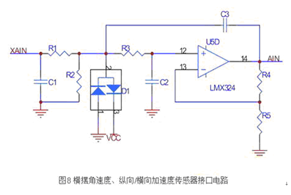 橫擺角速度、縱向/橫向加速度傳感器的安裝位置基本相同,輸出都是0V-5V的模擬量,由於汽車顛簸造成的信號波動特性一致,故封裝在同一模塊中。其硬件接口如圖8suoshi,shixianyingjianmoniqianzhilvbo,yiyizhilaizichuanganqidemonixinhaozhongdegaopinzaoshengchengfen,fangzhizaicaiyangguochengzhongchuxianhundiexianxiang。yunfangshiyongmanbaifushuchudeLMX324。