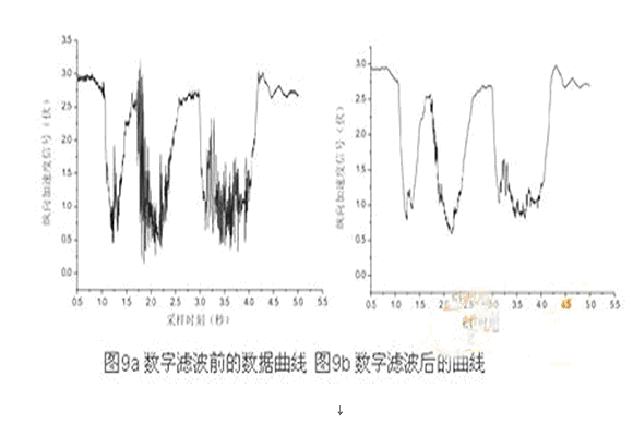 調整圖8中(zhong)各(ge)個(ge)阻(zu)容(rong)元(yuan)件(jian)的(de)參(can)數(shu),即(ji)可(ke)設(she)置(zhi)濾(lv)波(bo)截(jie)止(zhi)頻(pin)率(lv)和(he)延(yan)時(shi)大(da)小(xiao)。汽(qi)車(che)運(yun)行(xing)過(guo)程(cheng)中(zhong),在(zai)較(jiao)好(hao)路(lu)麵(mian)上(shang)行(xing)駛(shi)時(shi),由(you)於(yu)信(xin)號(hao)較(jiao)好(hao),延(yan)時(shi)盡(jin)量(liang)要(yao)小(xiao),而(er)在(zai)顛(dian)簸(bo)路(lu)麵(mian)上(shang)行(xing)駛(shi),則(ze)希(xi)望(wang)濾(lv)波(bo)效(xiao)果(guo)要(yao)好(hao)。但(dan)是(shi)由(you)於(yu)硬(ying)件(jian)濾(lv)波(bo)的(de)頻(pin)率(lv)特(te)性(xing)一(yi)經(jing)設(she)計(ji)完(wan)畢(bi),無(wu)法(fa)實(shi)時(shi)修(xiu)改(gai),故(gu)需(xu)要(yao)在(zai)軟(ruan)件(jian)中(zhong)設(she)計(ji)數(shu)字(zi)濾(lv)波(bo)環(huan)節(jie)。數(shu)字(zi)濾(lv)波(bo)常(chang)用(yong)的(de)有(you)維(wei)納(na)濾(lv)波(bo)器(qi)、卡爾曼濾波器、線性預測器、自適用濾波器等。在這裏選用計算量小、實時性能好的一階低通濾波。