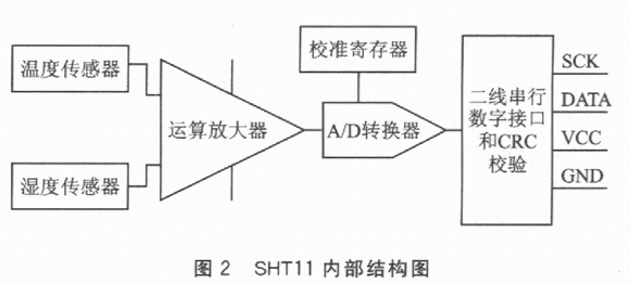 溫濕度傳感器SHTll集溫度傳感器和濕度傳感器於一體,因此采用SHTll進行溫濕度實時監測的係統具有精度高、成本低、體積小、接口簡單等優點;另外SHTll芯片內部集成了14位A/D轉換器,且采用數字信號輸出,因此抗幹擾能力也比同類芯片高。該芯片在溫濕度監測、自動控製等領域均已得到廣泛應用。
