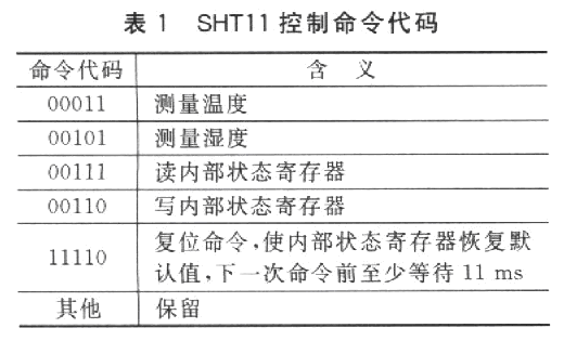 微處理器是通過二線串行數字接口與SHTl1進行通信的。通信協議與通用的I2C總線協議是不兼容的,因此需要用通用微處理器I/O口模擬該通信時序。微處理器對SHTll的控製是通過5個5位命令代碼來實現的,命令代碼的含義如表1所列。