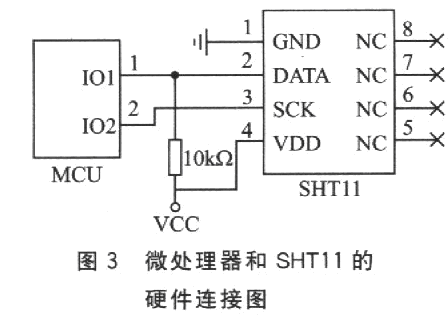 SHTl1通過二線數字串行接口來訪問,所以硬件接口電路非常簡單。需要注意的地方是:DATA數據線需要外接上拉電阻,時鍾線SCK用於微處理器和SHTll之間通信同步,由於接口包含了完全靜態邏輯,所以對SCK最低頻率沒有要求;當工作電壓高於4.5V時,SCK頻率最高為10 MHz,而當工作電壓低於4.5 V時,SCK最高頻率則為1 MHz。硬件連接如圖3所示。