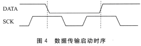 微處理器和溫濕度傳感器通信采用串行二線接口SCK和DATA,其中SCK為時鍾線,DATA為數據線。該二線串行通信協議和I2C協議是不兼容的。在程序開始,微處理器需要用一組“啟動傳輸”時序表示數據傳輸的啟動,如圖4所示。當SCK時鍾為高電平時,DATA翻轉為低電平;緊接著SCK變為低電平,隨後又變為高電平;在SCK時鍾為高電平時,DATA再次翻轉為高電平。