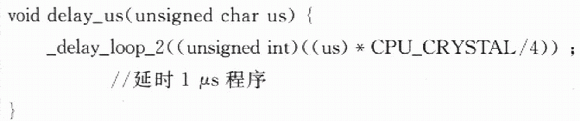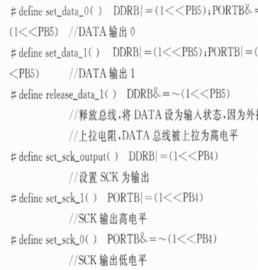 通過以上宏定義,可以實現SCK和DATA總線的各種輸入和輸出狀態。為了模擬該二線串行數字協議,還需要一個延時函數。WINAVR庫函數提供了一個延時函數_delay_loop_2(unslgned char s),該延時函數運行用4個時鍾周期,所以白定義延時1μs函數可以定義如下:#deftne CPU_CRYSTAL 7.3728