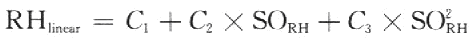 式中:RHincar為經過線性補償後的濕度值,SORH為相對濕度測量值,C1、C2、C3為線性補償係數,取值如表2所列。