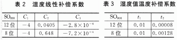 式中:RHtrue為經過線性補償和溫度補償後的濕度值,T為測試濕度值時的溫度(℃),t1和t2為溫度補償係數,取值如表3所列。