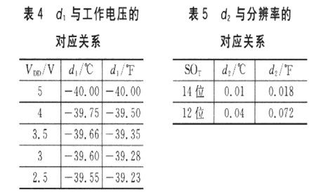 式中:d1和d2為特定係數,d1的取值與SHTll工作電壓有關,d2的取值則與SHTll內部A/D轉換器采用的分辨率有關,其對應關係分別如表4和表5所列。