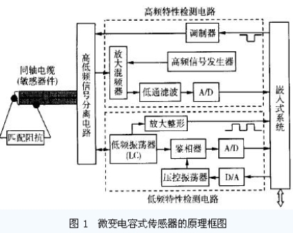 設計的微變電容式傳感器的原理框圖如圖1 所示。該傳感器由同軸電纜、高低頻信號分離電路、高頻特性檢測電路、低頻特性檢測電路和嵌入式係統等組成。高頻特性檢測電路監測同軸電纜特性阻抗的變化, 而低頻特性監測電路則監測同軸電纜分布電容的變化, 兩電路相互補充完成對同軸電纜的局部變形的監測和定位。