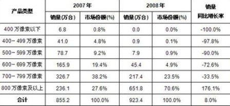 400萬像素以下產品完全退出市場,千萬像素產品成為市場主導