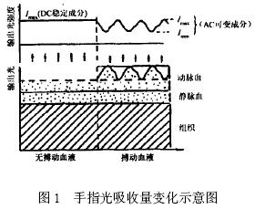 光電脈搏傳感器的研製和噪聲分析手指組織可以分成皮膚、肌肉、骨骼等非血液組織和血液組織, 其中非血液組織的光吸收量是恒定的, 而在血液中, 靜脈血的搏動相對於動脈血是十分微弱的, 可以忽略, 因此可以認為光透過手指後的變化僅由動脈血的充盈而引起的, 那麼在恒定波長的光源的照射下, 通過檢測透過手指的光強將可以間接測量到人體的脈搏信號。