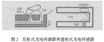 從光源發出的光除被手指組織吸收以外, 一部分由血液漫反射返回。其餘部分透射出來。光電式脈搏傳感器按照光的接收方式可分為透射式和反射式2 種, 其中透射式的發射光源與光敏接收器件的距離相等並且對稱布置,接收的是透射光, 這種方法可較好地反映出心律的時間關係, 但不能精確測量出血液容積量的變化; 反射式的發射光源和光敏器件位於同一側, 接收的是血液漫反射回來的光, 此信號可以精確地測得血管內容積變化。本文討論的是透射式脈搏傳感器, 側重於脈搏信號的測量。
