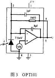 在本文中, 采用一種新型的光敏元件OPT101 , 該元件將感光部件和放大器集成在同一個芯片內部, 這種集成化的設計方式有效地克服了後端運算放大器空載電流輸出對光敏部件輸出電流的影響, 而且芯片輸出的電壓信號可以通過外部的精密電阻進行調節, 有利於芯片適應整體的電路設計, 同時芯片的集成化設計也能夠減小係統的功耗。