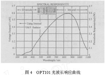 光電式脈搏傳感器主要由光源、光敏器件, 以及相應的信號調理控製電路構成。為了充分利用器件的效果, 光源和光敏元件的選擇是綜合考慮的, 光源的波長應該落在光敏元件檢測靈敏度較高的波段內, 圖4 為OPT101 的光波長響應曲線。