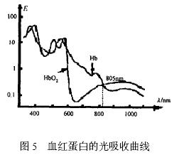 脈搏信號主要由動脈血的充盈引起, 而血液中還原血紅蛋白( Hb) 和氧合血紅蛋白( HbO2 ) 含量變化將造成透光率的變化, 當氧合血紅蛋白和還原血紅蛋白對光的吸收量相等時, 透射光的強度將主要由動脈血管的收縮和舒張引起, 此時能夠比較準確地反映出脈搏信號。圖5 為血紅蛋白的光吸收曲線, 從圖中可以看出, 血液中HbO2 和Hb 對於不同波長光的吸收係數的差異明顯, 而且2 條曲線好幾個不同的交點, 考慮到在805 nm 波長處, 血紅蛋白的光吸收率比較低, 那麼透射過手指的光強較大, 有利於光敏器件的接收, 因此發射光源的波長選擇為805 nm。