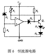 圖6 為恒流源電路, 在電路中R1 兩端的電壓值恒等於穩壓二極管D1 的穩壓值,因此流經R1 的電流值恒定,控製使三極管Q1 處於放大狀態, 那麼流過發光二極管D3 的電流值恒定,因此發光二極管D3 能輸出穩定光強的光。[page]